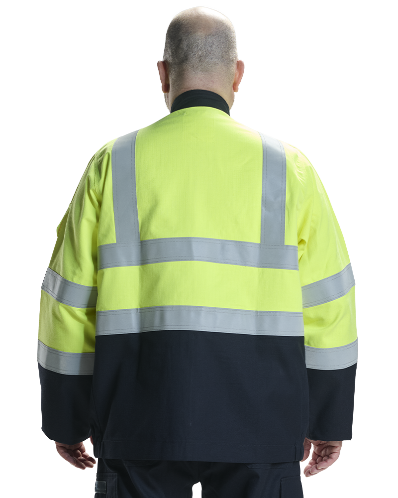 Flame-retardant reflective tape Two-tone high-visibility 2 Chest pockets 2 Front pockets Pen pocket on left sleeve